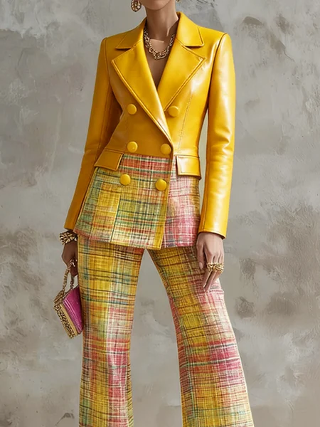 Urban Geometric Plaid Faux Leather Lapel Coat