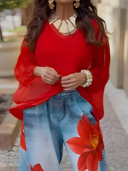 Casual Letter Pattern Eyelet V Neck T-shirt