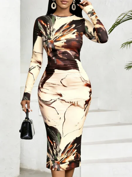 Elegant Floral Printing Crew Neck Midi Dress