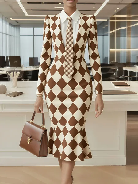 Casual Plain Turtleneck Knee Length Dress With Bow Brooch