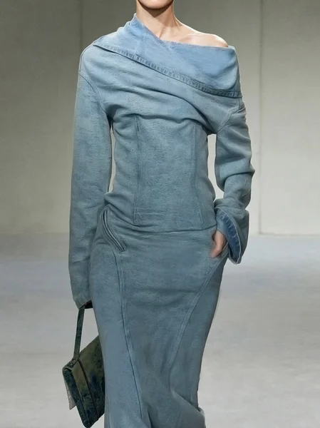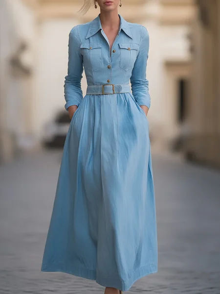 Denim Casual Plain Balloon Sleeve Tassel Turtleneck Mini Dress
