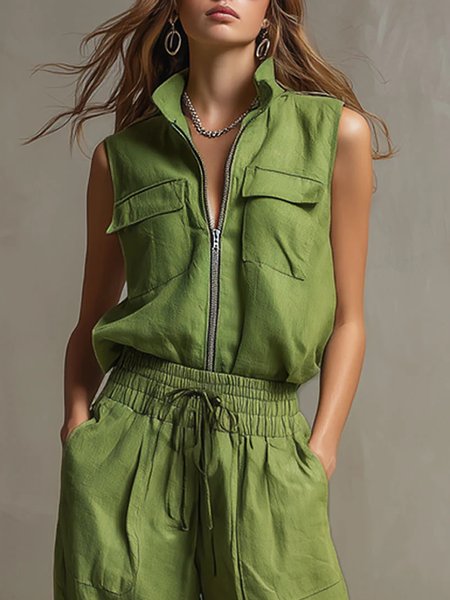 Cotton Casual Zipper Plain Shawl Collar Vest
