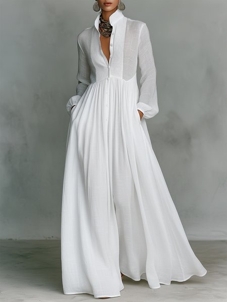 Plus Size Cotton Casual Plain Ruched Stand Collar Maxi Dress