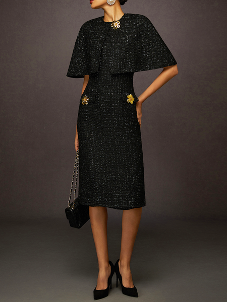 Elegant Tweed Crew Neck Midi Dress with Decorative Buttons