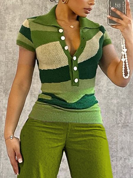 Elegant Color Block Buttoned Shawl Collar Sweater