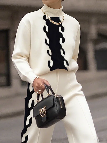 Casual Color Block Turtleneck Sweater with Sheer Ruffle Cuffs